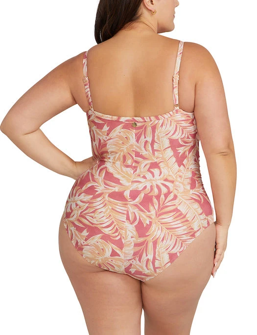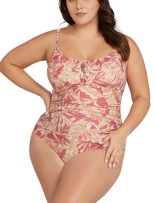 Artesands fits your curves. Degas is designed for our feminine side. This shape has an on trend drawstring in the front neck which falls softly along the bust. Our curve fit and plus size one piece shape Degas has full body powermesh and ruching for body sculpting. This curve fit and plus size one piece swimsuit has multifit cup support to fit a C cup to DD cup with removable soft moulded cups. Degas has good moderate bottom coverage.