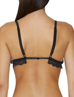 A triangle bra all in black lace with cups can be undone to reveal the breasts using the magic button at the strap. The straps are adjustable with a lace braid tie.