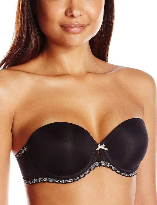 B.Tempt’d 954108 Faithfully Yours Strapless bra is a smooth, molded push-up with cups that are set into a mesh frame for great support and lift. It is styled with pretty floral contrast trim and bow detail. The silky knit fabric helps clothes glide on easily. Comes with detachable, adjustable straps for total convertibility.