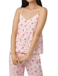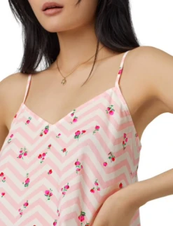 These cami tank organic cotton pajamas in a pink chevron and red floral print blend comfort and contemporary style. Pants with an elastic waistband and drawstring, side pockets, and contrast piping at the cuffs are pretty and practical.