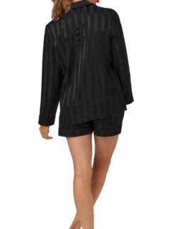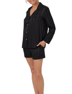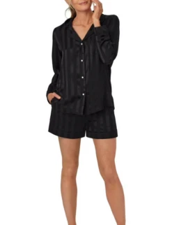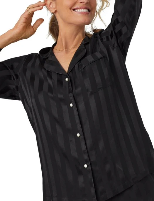 Savor the moment in our 100% silk satin long sleeve shorty pajamas. A chest pocket, notch collar, and contrast piping on the collar and hems add refinement. Pants with an elastic waistband, drawstring, and pockets are comfortable day or night. Washable.