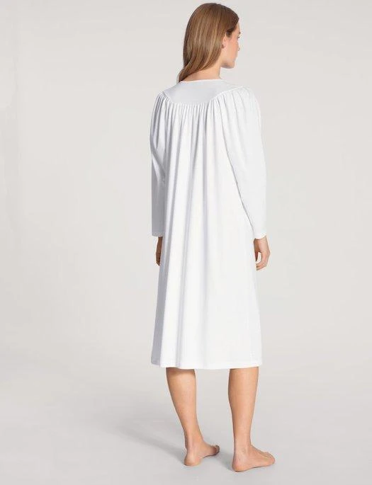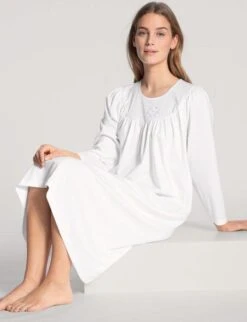 Pull on a soft, warming dose of comfort in the Calida Soft Cotton Nightdress. This popular long-sleeved nightshirt has a comfortable, relaxed raglan cut and features a wide chest yoke with an embroidered blossom and abundant pleats.