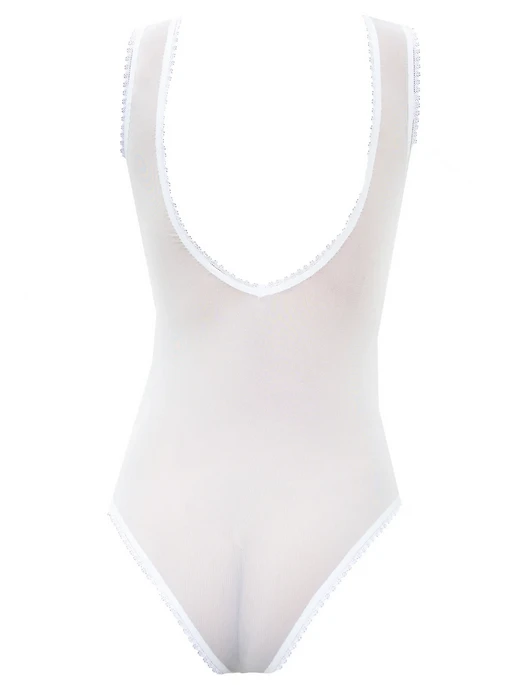 This is a show-stopper, one of a kind piece. Sheer unlined embroidered tulle with 3D flowers, crystals and sequins, this bodysuit is specially composed with stretch mesh low scoop back for that perfect fit. Adjustable hook and eye and crotch lined in 100% cotton.