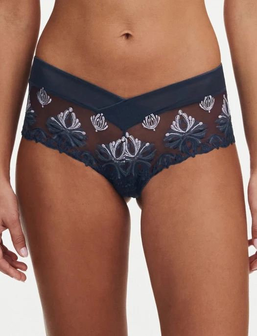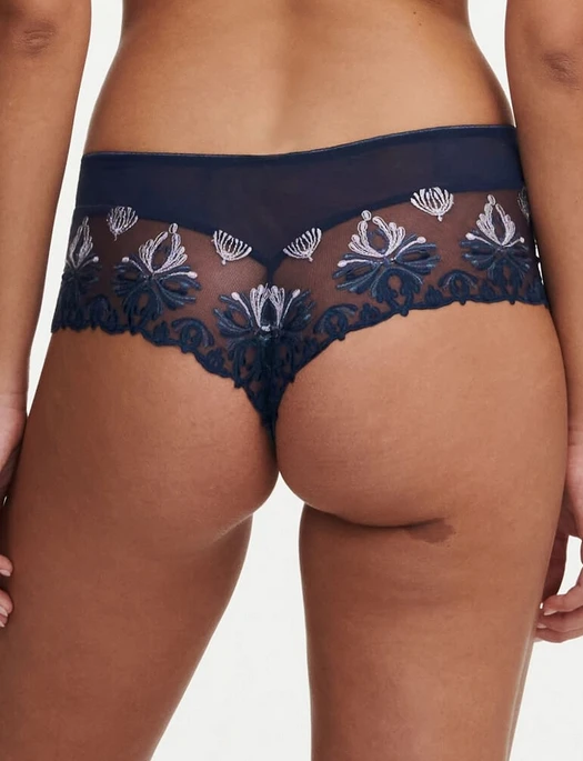 Ornate embroidery covers the gorgeous Chantelle Champs Elysees sheer mesh, low-rise hipster.