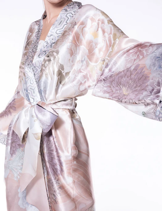 Featuring dramatic, kimono style sleeves and a contrast collar, this kimono is perfect for calm nights and relaxed musing.