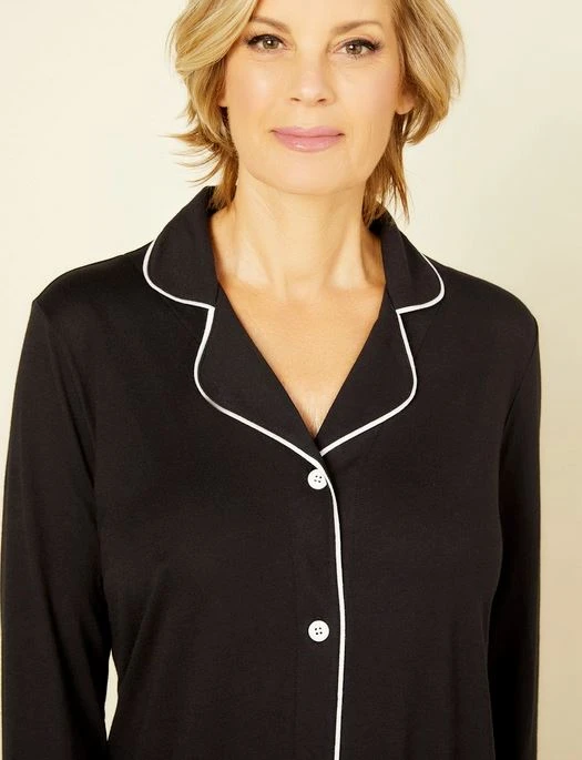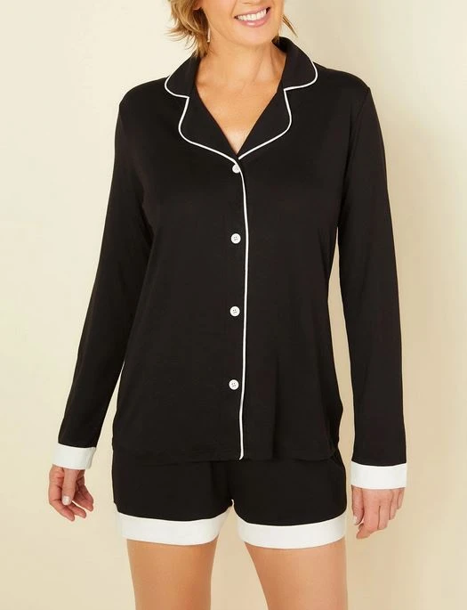 Cosabella’s classic Bella Pajamas made with the best Pima Cotton available. Super soft Pima cotton and modal set with contrast color at sleeves and legs. Relaxed fit with contrast trim. Drawstring waist boxers with long sleeve button-down top.