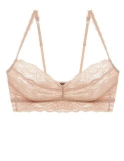 The Cosabella Never Say Never Beauty Sweetie bralette is made of soft, stretch non-sheer scalloped lace that lays flat and is lined with power mesh for support. It has wide straps that won’t dig and a supportive band under the bust. Pullover style.