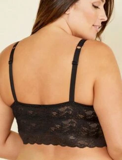 The Cosabella Never Say Never Extended Plungie bralette is made of soft, stretch non-sheer scalloped lace that lays flat and is lined with power mesh for support. It has wide straps that won’t dig and a supportive band under the bust. Pull over style.