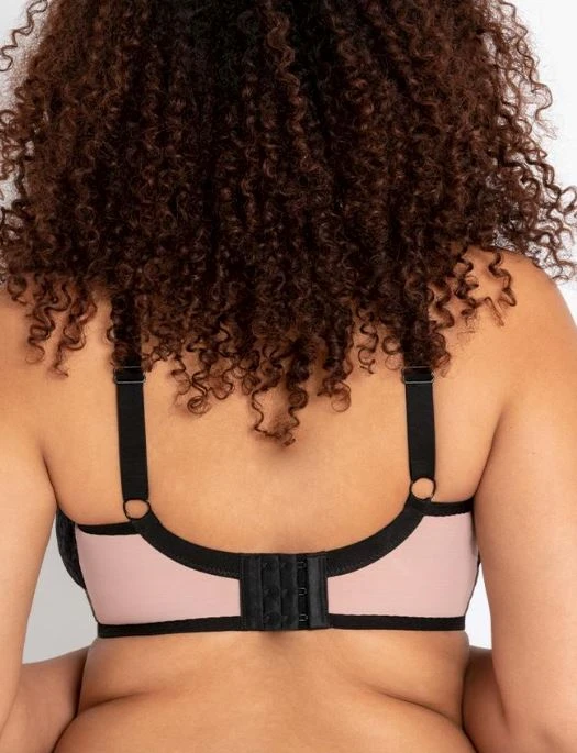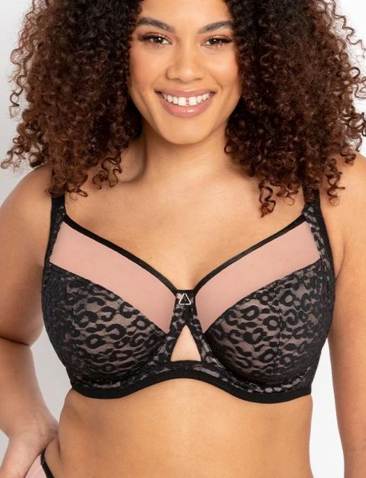 Curvy Kate Victory Wild Bra. Same fitting as our famous Victory bra this new gorgeous leopard effect black lace gives the same side support and upfront engineering, designed to uplift and shape your curves. The lace is laid over a blush liner. The 4-part cup offers exceptional fit, made to pull the bust in from the side for a great natural shape. Sleek and stylish, incorporating mesh panelling and fashionable cut outs. Underwired and non-padded with adjustable straps.