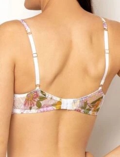 Based on the Sachi EL4350 UW Plunge Bra. Low centre front gives plunge without push up. Three section cup plus side panel for forward shape, good uplift and separation. Unlined tulle top for a light and sexy look. Cup is overlaid with flat lace which features a floral design in a mix of matte and shiny yarns. Overlapping oval metal detail to cup apexes and centre front
