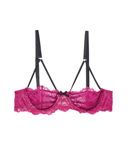 Our ultra sexy Roxy Lace Half Cup Bra Play features lace half cup with silk front straps that frame the bust. Bows at center front and back strappy detail. Fully adjustable straps for the perfect fit.