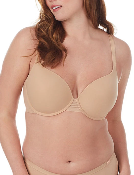 A modern t-shirt bra designed to make you look your best without sacrificing fashion, fit or comfort. Featuring plush hybrid memory foam cups that comfortably molds to the shape of your body and provides natural lift and soft rounded shape. Contour cups with compressed edges are wrapped in a smooth seamless molded voile microfiber that is designed to be light and airy while laying completely flat against the body. The Voile microfiber hugs the body and provides perfect 2 way stretch for flexibility and comfort, while built up 2 ply back wings provide back smoothing. Panels of the sheer shadow stripe elastic are teamed with voile to provide a highly functional problem solver with style. Fully adjustable straps and rose gold hardware.