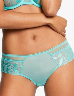 The Maison Lejaby Sin Shorty is a stunning silky pant featuring floral lace sides in a sheer style with a shorty cut and cheeky coverage.