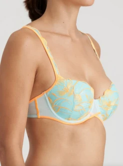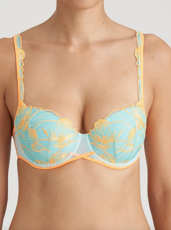 Elegant and festive balcony bra with padded cups. The pre-formed cups are adorned with a beautiful floral motif in delicate floral embroidery.