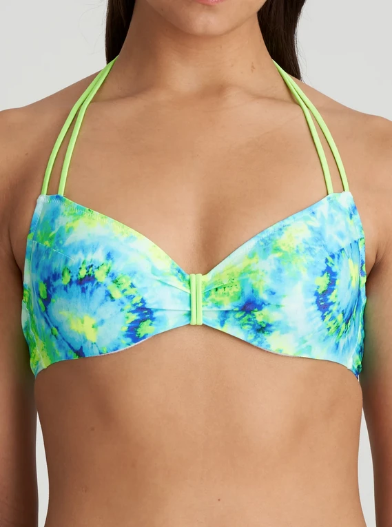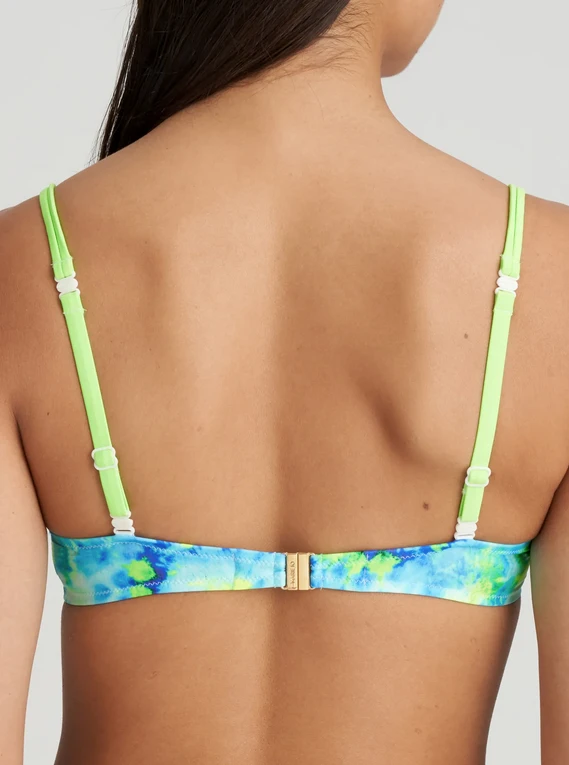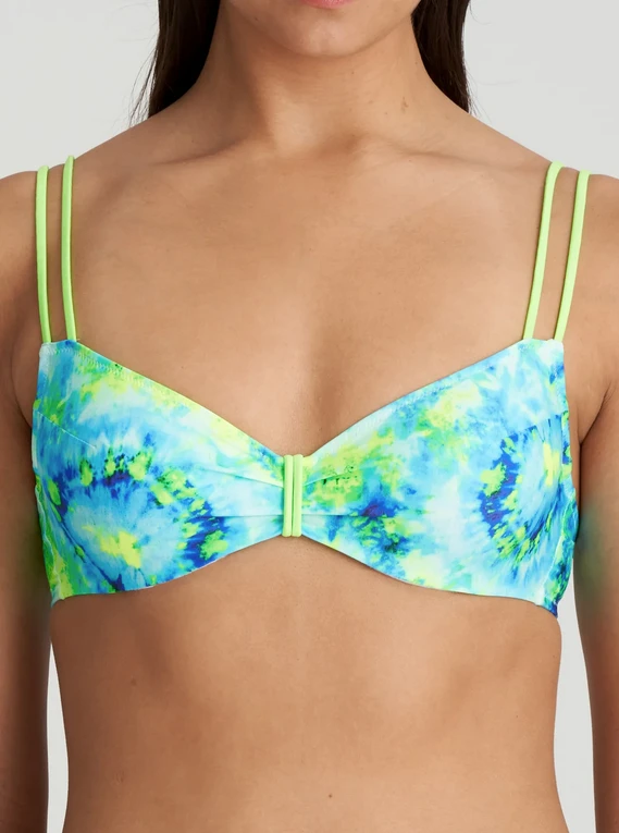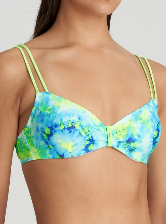 A full cup bikini top in a tie-dye fabric with fine, adjustable shoulder straps. The pattern is fun and reminiscent of the 1990s. If you like retro prints and the flashy colors yellow, blue, and green: you’ll love Landscape!
