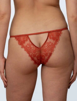 The blend of warm amber lace with delicate satin bound strapping is set off by the eyelash detailing to the scallop lace at the front. Turning around, the simplicity of the satin is complemented by a playful cut out between the cheeks. The knicker sits low on the hip and high on the leg for an elongated silhouette and touch of everyday sensuality.