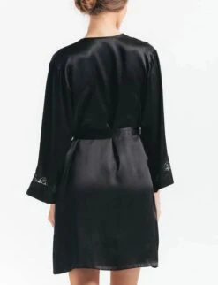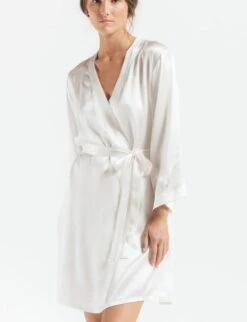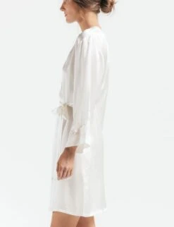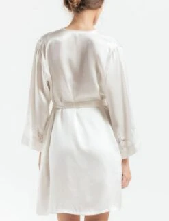 With its silk and vintage lace construction, the NK iMode Morgan Robe gives an elegant first impression. Easy living in silk charmeuse daintily trimmed short robe with a dash of lace and indispensable side pockets.