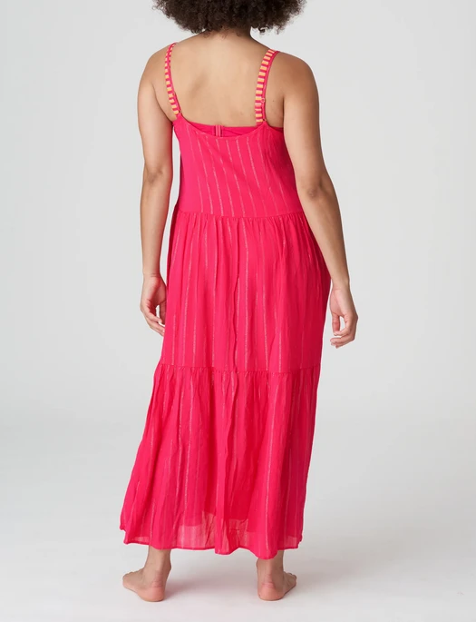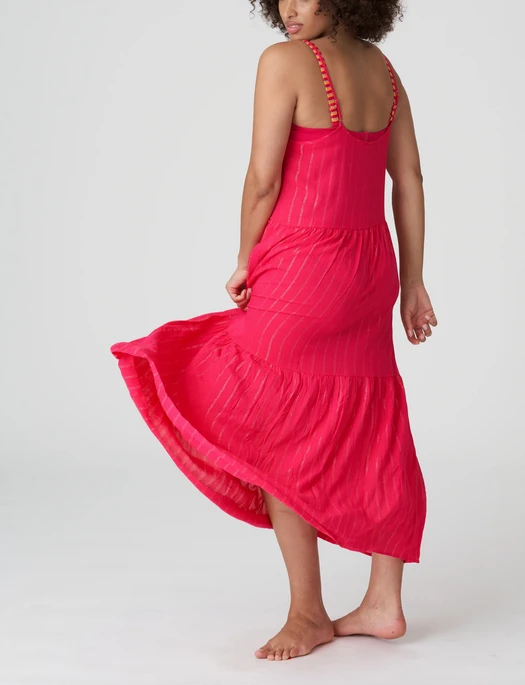 Long dress with spaghetti straps with flounces at the knee and waistline. Mai Tai is a mix of bright red, orange, and gold. It has a true 80’s feel.