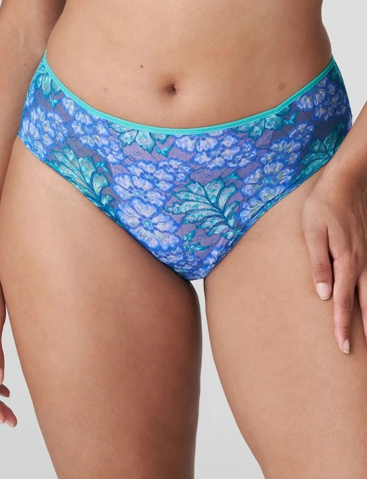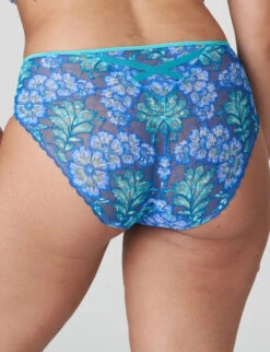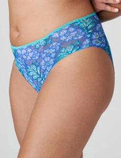 Stylish, high-waisted briefs in a colorfully printed, recycled lace fabric with sexy drawstrings to the back. Finished with beautiful trim at the back. Mermaid Blue is the color of the Atlantic Ocean on a tropical day – Summery with a trendy hint of retro.