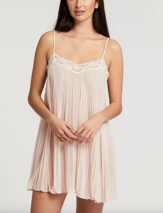 A cascading, accordion-pleated chemise. Light and airy, this chiffon chemise dreams of movement while the sheerness desires sensuality. A delicate lace trim frames and emphasizes its beautiful laced-up back. This chemise is perfect for the romantic occasion you’ve been waiting for.