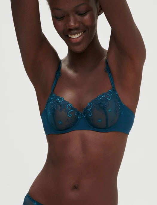 Feel feminine in the Simone Perele Delice sheer demi bra decorated with ultra-sensual embroidery. Seductive, yet so much more than a seduction bra, this exquisite demi offers fabulous French style and a fit you can feel confident in, up to F cup.