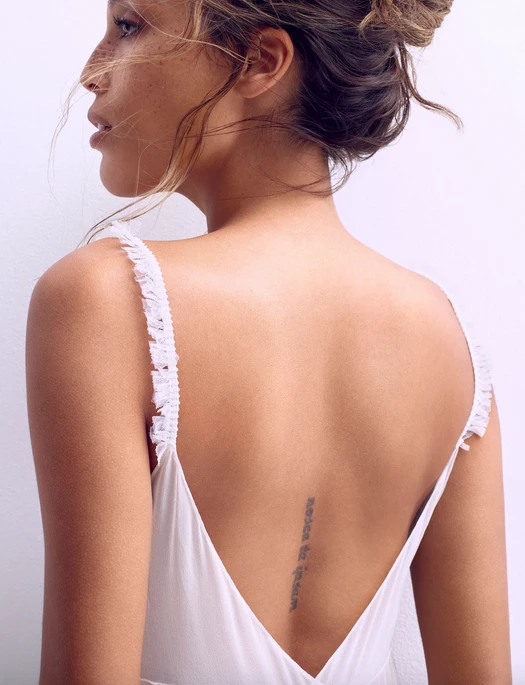 Silk chiffon sheer chemise in Ivory. The flirtiest of necklines with tulle trim straps and matching hem.