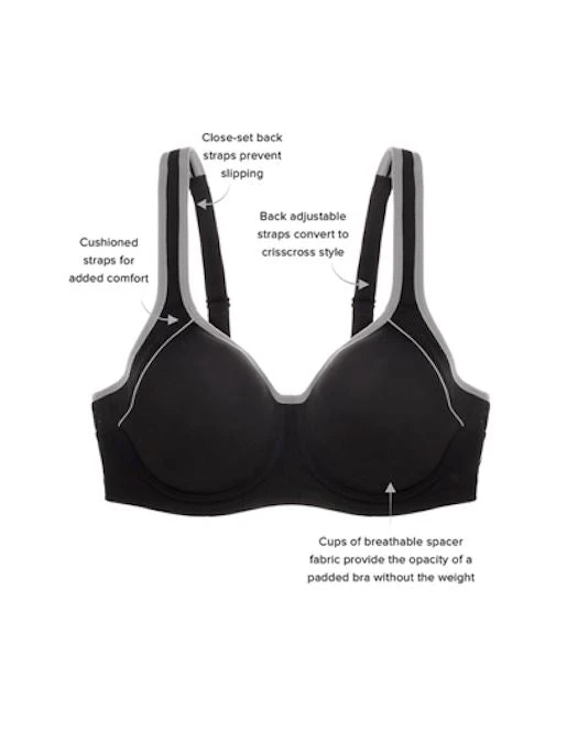 Fashion meets function in this sport bra with underwire. Breathable cups of spacer fabric provide modesty, the design minimizes bounce, and the convertible straps add versatility. Mesh details give a sporty look that takes you easily from your fitness class to your errands and beyond.