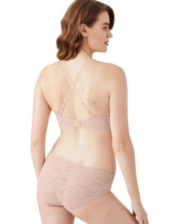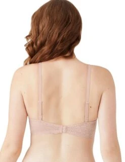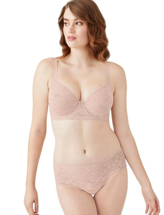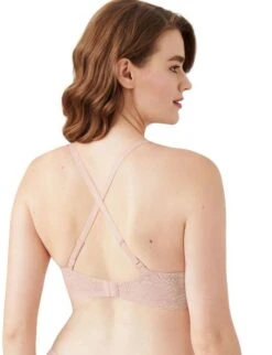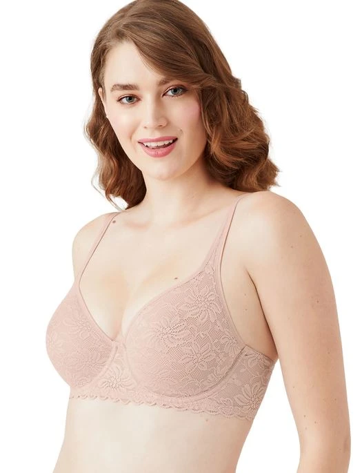 The Wacoal Soft Sense Seamless Underwire bra has a flat soft overall stretch lace. Cups are lined with mesh for natural shaping. The stretch lace is carried through the wing. Lower band and wing feature feminine scalloped trim. We love the convertibility feature to wear regular or crisscross the straps using a new style barrel slide clasp on the strap. It’s extra secure so no coming undone.